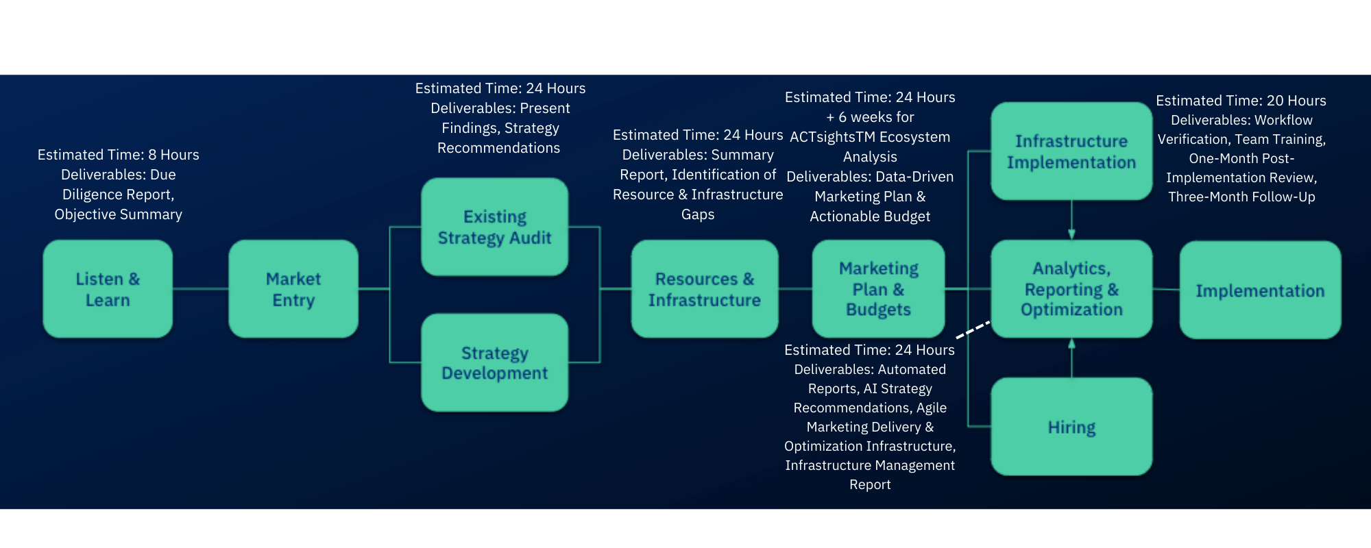 We recommend beginning with 1-2 key modules, and expanding as needed, to create a milestone-based strategy. Starting with a comprehensive Listen & Learn module, our approach ensures alignment among senior teams and a clear understanding of marketing needs. Subsequent phases, including a detailed strategy audit and resource evaluation, provide actionable insights and tailored recommendations. By developing data-driven marketing plans and leveraging robust analytics, this method ensures that each phase is both targeted and cost-efficient. Finally, the implementation stage focuses on equipping your team to execute strategies effectively, with follow-up assessments to support continuous improvement and long-term success.